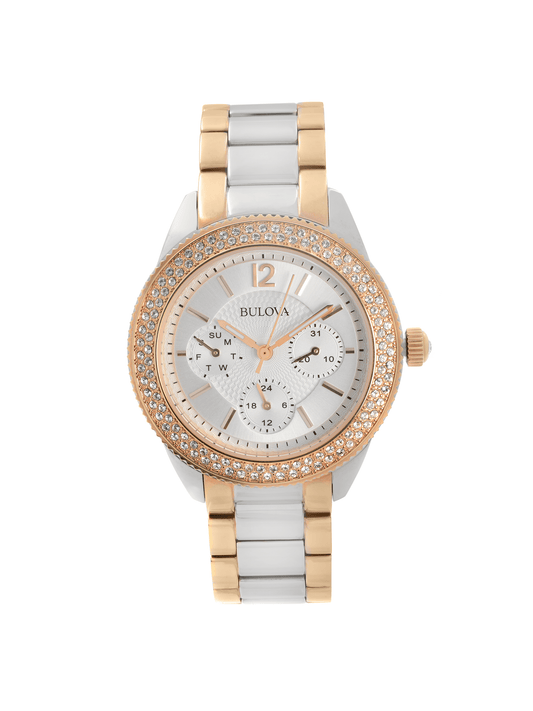 Women'S Crystal Accented Bezel Silver Dial Two Tone Rose Gold Steel 98N100 Watch